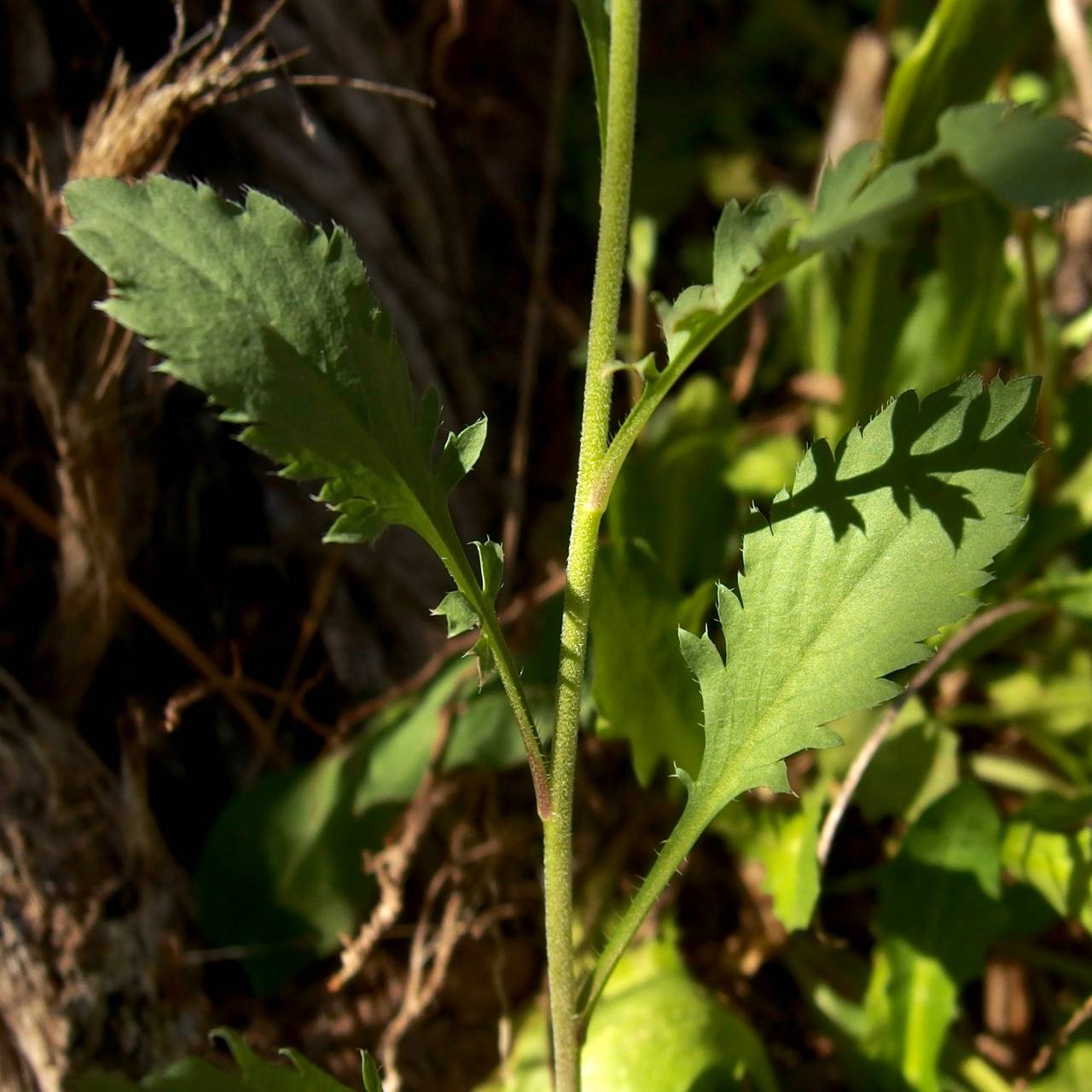 Lower leaves are sharp toothed to pinnately divided or even twice pinnately divided, wilted, sparsely hairy.
